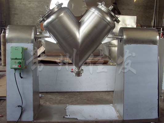 該機(jī)通過機(jī)械傳動(dòng),使不對(duì)稱的V型圓柱體內(nèi)的物料做往復(fù)翻動(dòng),達(dá)到均勻混合之目的。