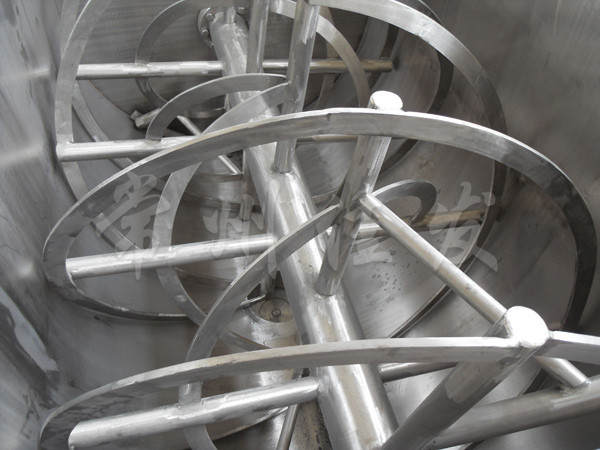 該機(jī)型由容器 螺旋攪拌葉片和傳動(dòng)部件組成,螺旋葉片一般做成雙層或三層,外層螺旋將物料從兩側(cè)向中央?yún)R集,內(nèi)層螺旋將物料從中央向兩側(cè)輸送,形成對流混合。容積可做成圓形,以便夾套及于反應(yīng)干燥。
