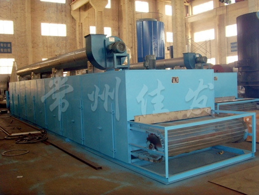 The material is evenly laid on the mesh belt by the feeder, and the mesh belt is generally made of 12-60 mesh stainless steel wire mesh, which is dragged by the transmission device and moved inside the dryer. The dryer is composed of several units, each with independent circulation of hot air. Part of the exhaust gas is discharged by a dedicated wet fan, and the exhaust gas is controlled by a regulating valve. The hot air passes through the mesh belt covered with materials from bottom to top or from top to bottom to complete the process of heat and mass transfer, taking away the moisture of the materials. The mesh belt moves slowly, and the running speed can be automatically adjusted according to the material temperature. The dried finished product continuously falls into the feeder. The upper and lower circulation units can be flexibly equipped according to user needs, and the number of units can also be selected according to needs.